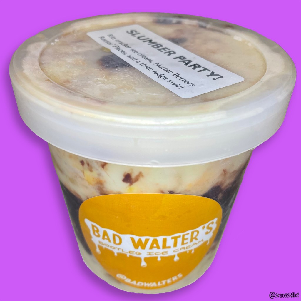 When I first wrote here about emerging lactose-free artisan ice cream queen Bad Walters I mentioned the amazing base quality and massive potential with a desire for more mix-in density. Those qualms have been answered beyond my wildest dreams with the latest monthly masterpiece and absolute BANGER of a pint in Slumber Party: Ritz Cracker ice cream with Nutter Butters, Reese’s Pieces, and a thicc fudge swirl.