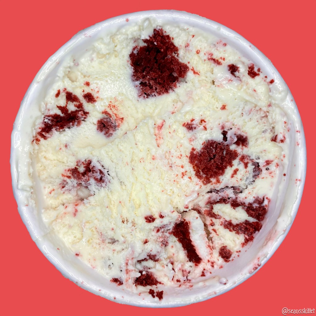 The lone mix-in, pieces of red velvet cake, are abundant. The entire pint from top to bottom is packed with sexy chunks of vibrantly red moist red velvet love. They have a delightful sponge-y chew and buttery taste rounded out by ever-so-slight notes of cocoa. Some of the frosting clings to the cake as intended and some breaks off in churning rebellion. The frosting is slightly firm and sweet. There’s a density to frosting that stands out in ice cream and it is truly such a wonderful texturally contrasting mix-in. I really enjoy the extra pops of sweetness with a touch of grit every time they arrive on my spoon.
