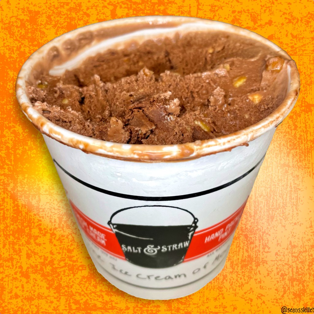 The chocolate base initially took me by surprise, but I think I’ve settled into appreciating it. The texture is a bit lighter and airier than the epic density I’m used to from Salt & Straw. It isn’t actually airy like like a cheaper ice cream with high overrun, it’s definitely still super premium, just a touch more churned than I’m used to. The flavor is a relatively light and milky chocolate taste that reminds me of a Wendy’s chocolate frosty, or a malt cup without the malt, plus some delightful saltiness. The salt causes the base to temper quicker than your average S&S pint, and since it’s described as “silky” I think it definitely fits the bill. It’s a solid foundation but ultimately the least interesting part of this ice cream.