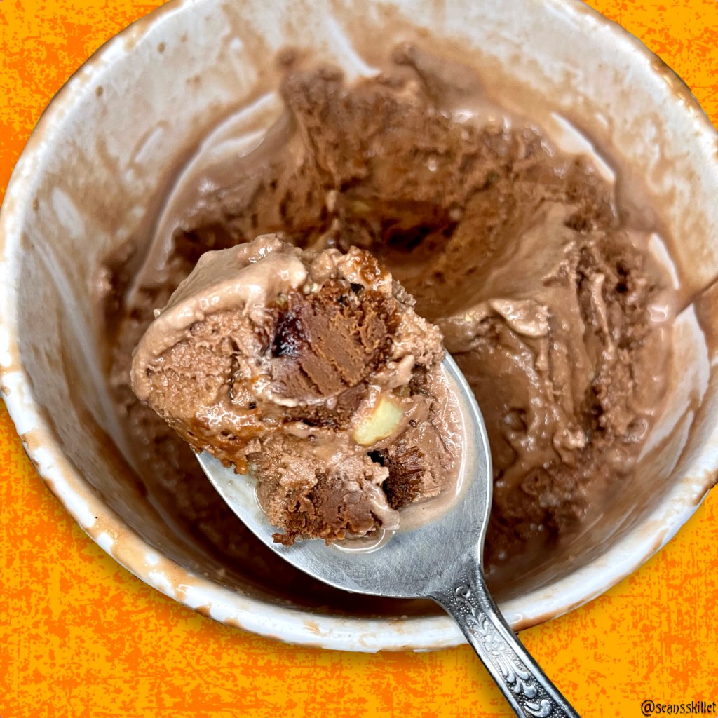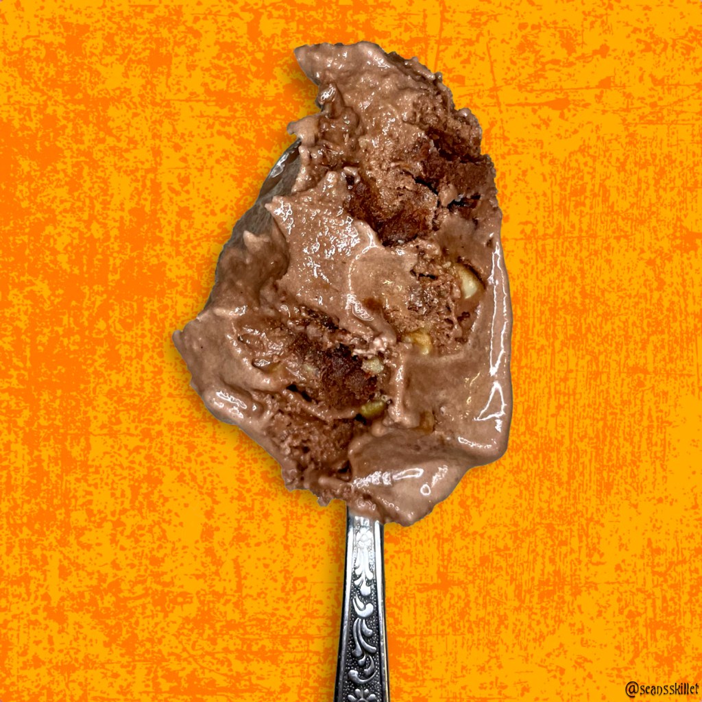 There are only two mix-ins but there’s plenty of them! The candied caramel cashews bring a different type of saltiness to the profile, with a hint of burnt sugar that has no doubt seeped into the base to cover up some of the cocoa’s typical bitterness. I love the flavor of cashews and that unique fatty earthiness comes through surprisingly well. What I’m not quite as fond of is the texture. The texture isn’t bad, but it’s more cashew than it is candied, as in, it has the softer chew of a roasted nut as opposed to the hard crunch of a praline. I still enjoy eating them but I would have loved a crunchy component to really add some chomp-y depth to the pint.