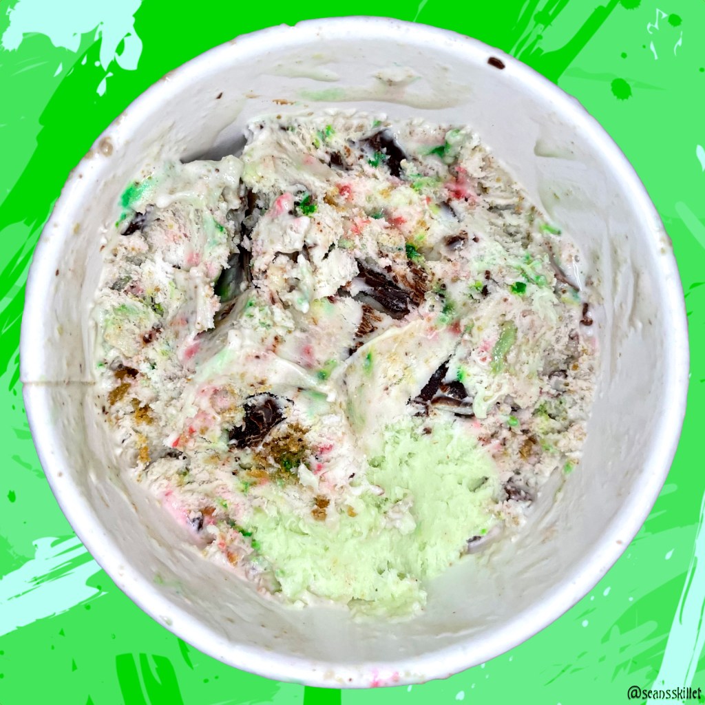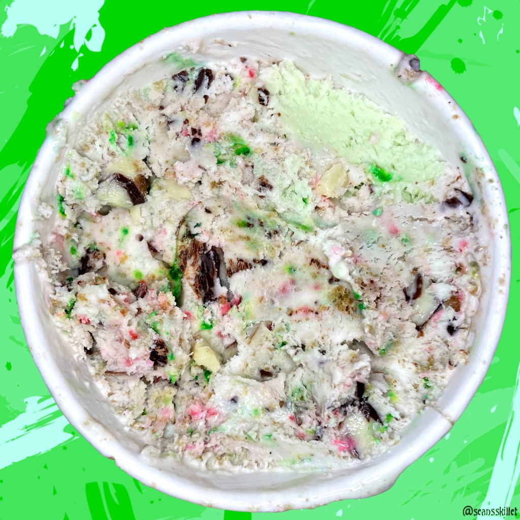 Also in every other bite, or nearly every bite, are the variably sized shards of chocolate. There’s both a darker bittersweet chocolate and more traditionally sugary white, which adds a firm crunch and great sweetness to the delicious sea of controlled madness. There are also super crunchy ball-shaped Christmas-colored sprinkles which bleed into the base for more visually appealing chaos. It’s like an epic technicolored chocolate chip ice cream at its core, and it’s so fun to eat.